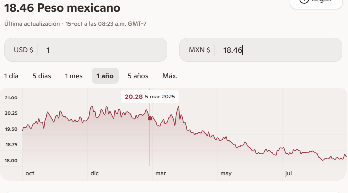 Este miércoles 15 de octubre de 2025, el tipo de cambio del dólar estadounidense frente al peso mexicano refleja una jornada de presión para la moneda nacional. El dólar se cotiza en 18.46 pesos por unidad, marcando una ligera apreciación respecto al cierre anterior, en medio de un entorno internacional marcado por nuevas tensiones comerciales entre Estados Unidos y China.