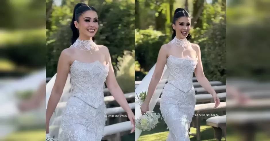 Lupita Villalobos optó por un conjunto de dos piezas: un corset con escote de tres puntas y una falda corte sirena, sin velo, pero con una cola de tul sostenida por un collar de piedras blancas.